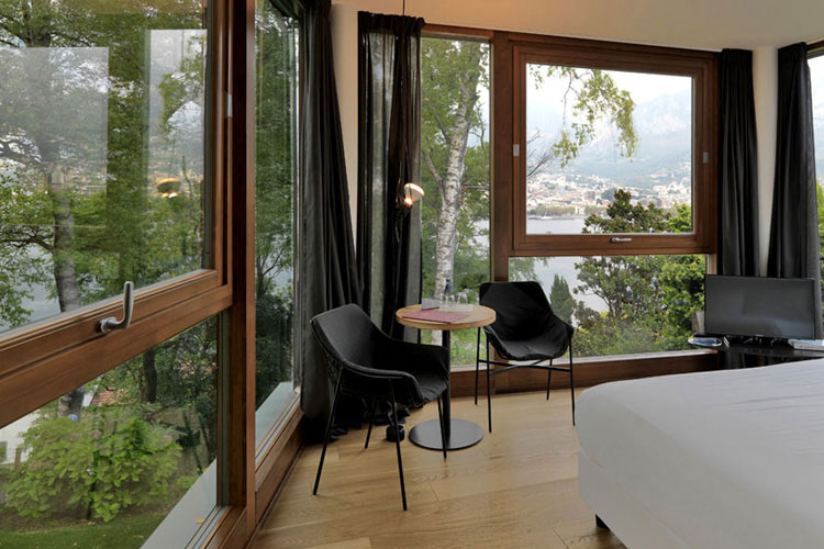 Tra Gli Alberi, Una Casa is een bijzonder project. Voor zorg voor details uitgedacht, fraai zonder opzichtig te willen zijn. Luxe maar op een vanzelfsprekende, uitnodigend manier. Warme materialen als steen en hout, kenmerkend voor de streek, zijn gecombineerd met moderne materialen als staal en glas. Heel veel glas, raampartijen van plafond tot vloer, die het unieke uitzcht op het meer en de bomen rondom optimaal in de kamers laten beleven. Logeren hier voelt dan ook haast aan alsof je je in boomhut bevindt. De twee strak vormgegeven, langgerekte huizen staan naar het meer gericht en verschaffen een optimaal zicht op de natuur rondom. Naast de vijftiental kamers en suites, telt het hotel een zwembad, een schitterende galzen ruimte waar het ontbijt wordt geserveerd en andere gemeenschappelijke ruimtes zoals een gym, wellness en spa.